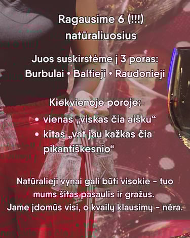 Darysim taip: išrinkome šešis (!!!) vynus. Juos suskirstėme į tris poras: burbulai, baltieji ir raudonieji. Kiekvienoje poroje - vienas “vynas kaip vynas”, o kitas - iš “vat jau kažkas čia pikantiškesnio” grupės. Natūralieji gali būti visokie - tuo mums šitas pasaulis ir gražus. Jame įdomūs visi, o kvailų klausimų - nėra. Čia gali rasti ir visai netikėtų skonių, ir visai įprastų. Ateisi, išragausi, ir bus aišku, kas patinka.