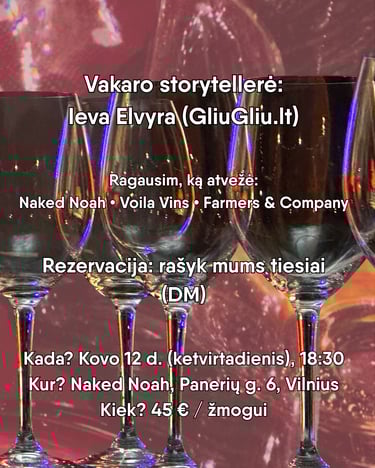 Pokalbiai prie vyno ir apie vyną tinka beveik bet kokia proga - šeimos ar draugų susibėgimams, gimtadieniams, mergvakariams, įkurtuvėms ir viskam, kam turime fantazijos. Kartu suderinsime degustacijos temą ir vynus, ir aš su viskuo prisistatysiu arba pas Jus į svečius, arba pakviesiu pas bičiulius į vyninę Vyno vieta ar jaukią Dekolab studiją privačiai šventei. O jei proga ir fantazija ves ieškoti naujų lokacijų - rasim!